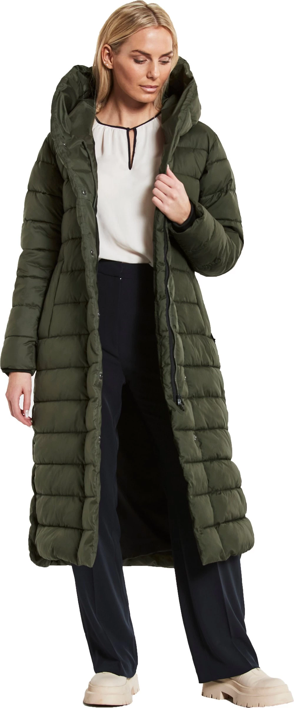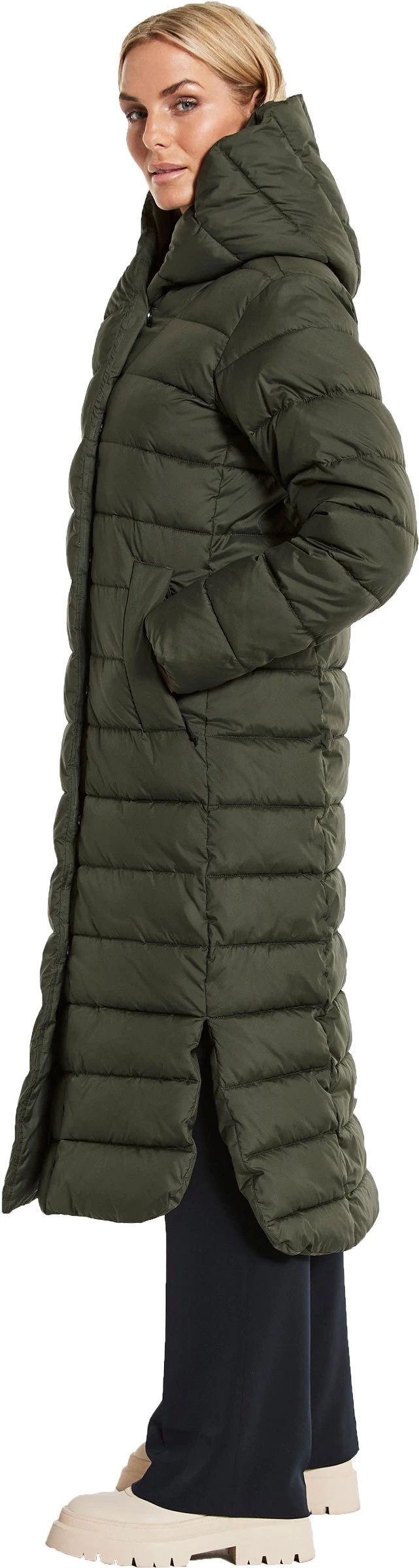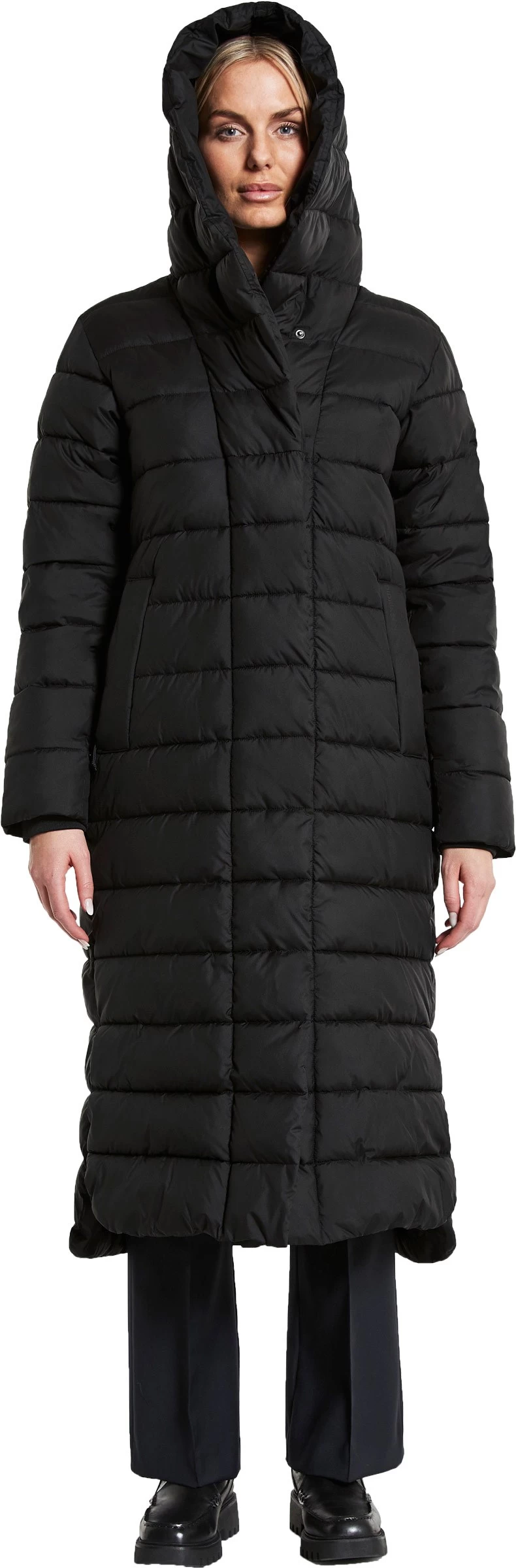 Stella Parka Long Women er udstyret med en stor og varm hætte og en dejlig høj krave, der giver god varme og komfort på de kolde vinterdage. Frakken lukkes med en tovejs lynlås ned til midt på låret, som sammen med den elegante sideslids sikrer et pænt og feminint snit og en god bevægelsesfrihed.
