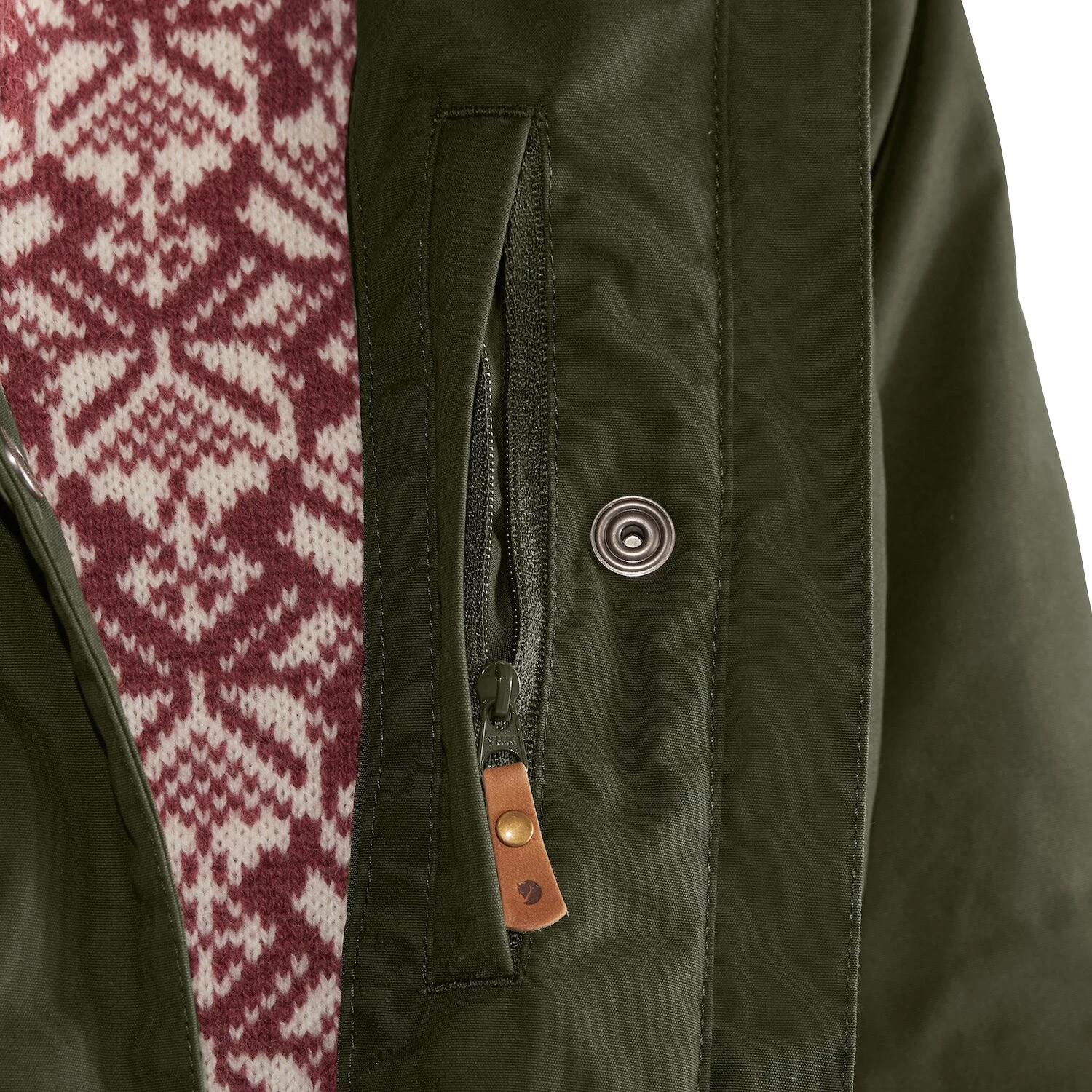 Der er mulighed for sammensnøring i livet efter behov, og vidden på ærmeafslutningerne reguleres med knaplukninger. På fronten er Fjällräven Karla Hydratic Jacket Women nederst udstyret med to rummelige og lynlåslukkede stiklommer med lunt fleecefor, som er gemt bag vejrbeskyttende stormflapper, og indvendigt er der en lynlåslukket lomme til pengepung og mobiltelefon.