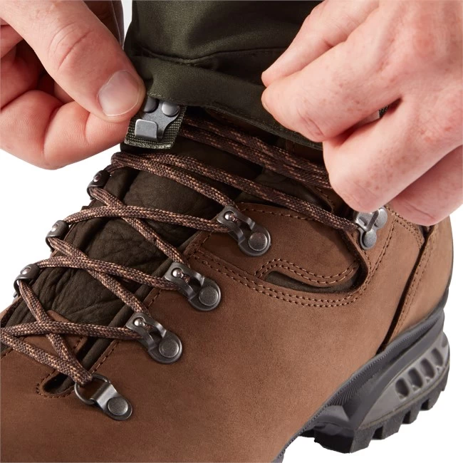Omkring ankelen reguleres vidden med en justerbar rem, og den integrerede krog, som griber fast om fodtøjets snørebånd, sikrer, at buksebenet bliver på plads.