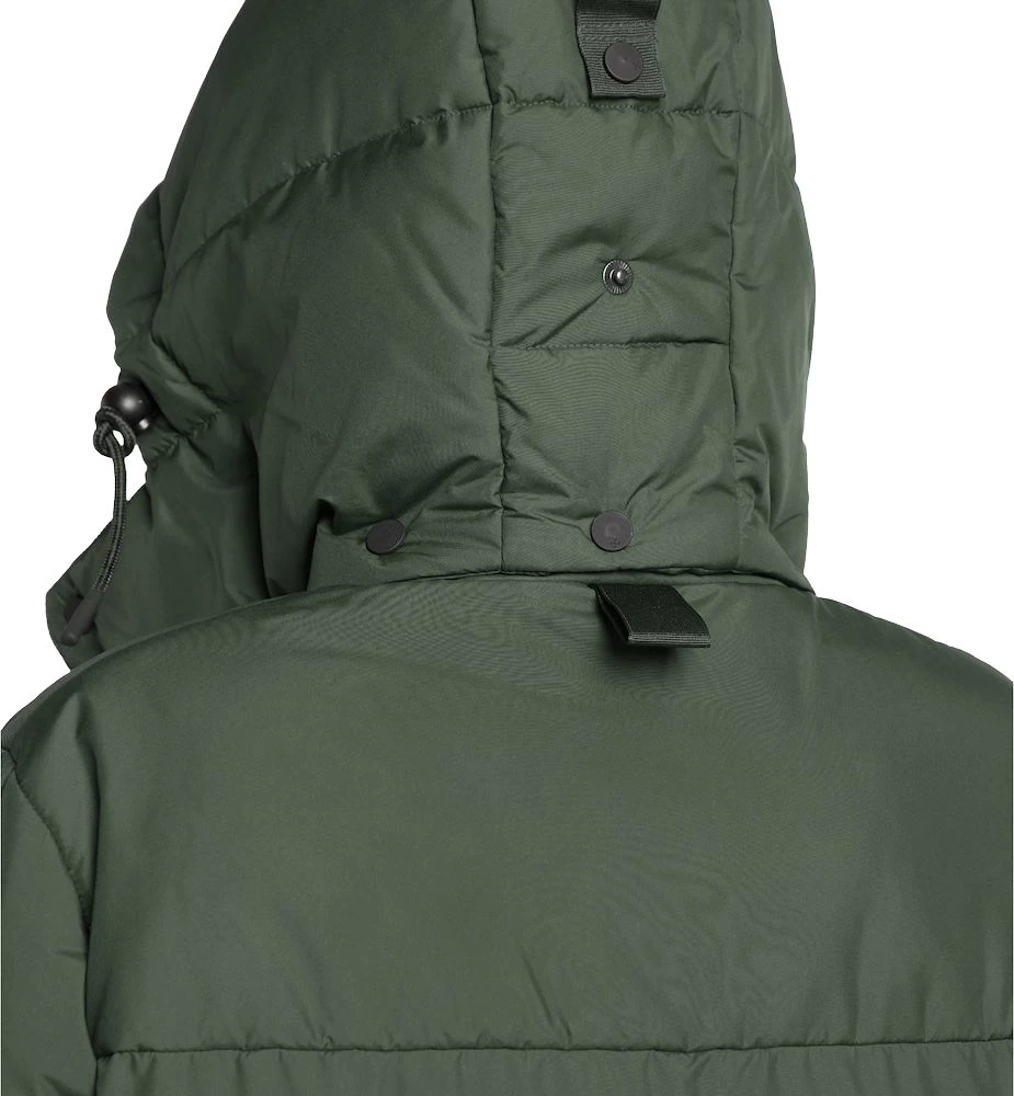 Den aftagelige hætte, som er med snorelukning i hættekanten og knapjustering i nakken, er fuld justerbar i begge dimensioner og giver både hurtig og umiddelbar varme på de koldeste og mest blæsende dage, men lukker også rigtig godt af for piskende sludbyger. Den tilpas høje krave er selvfølgelig dejligt foret, så den giver fantastisk god varme omkring hals og nakke.
