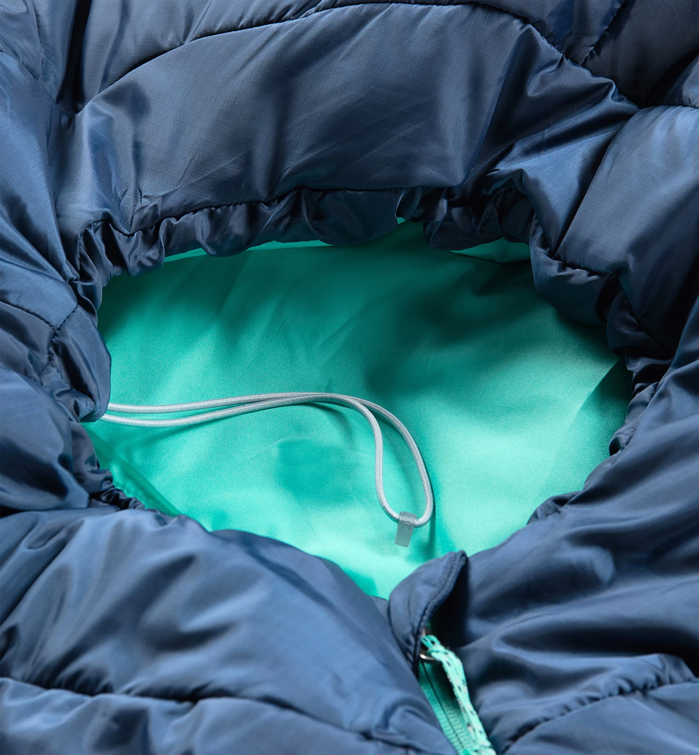 Den velformede hætte er skåret tredimensionelt, så pasformen er i top, og er selvfølgelig enhåndsjusterbar. Når hætten er snøret godt sammen, følger den faktisk fuldstændig hovedets bevægelser, og hættens åbning er skåret så tilpas lille, at unødigt varmetab undgås. En lille, ekstra, fiberfyldt kanal langs hele åbningens kant, højner komforten og forsegler mod den kolde vind. En smart detalje er i øvrigt lommen under hovedet, hvori du kan placere en pude eller en trøje, som så vil fungere som hovedpude.