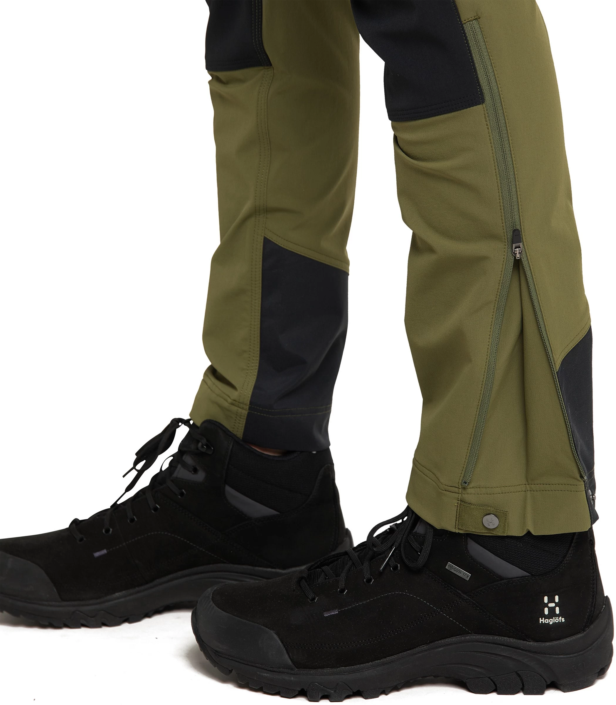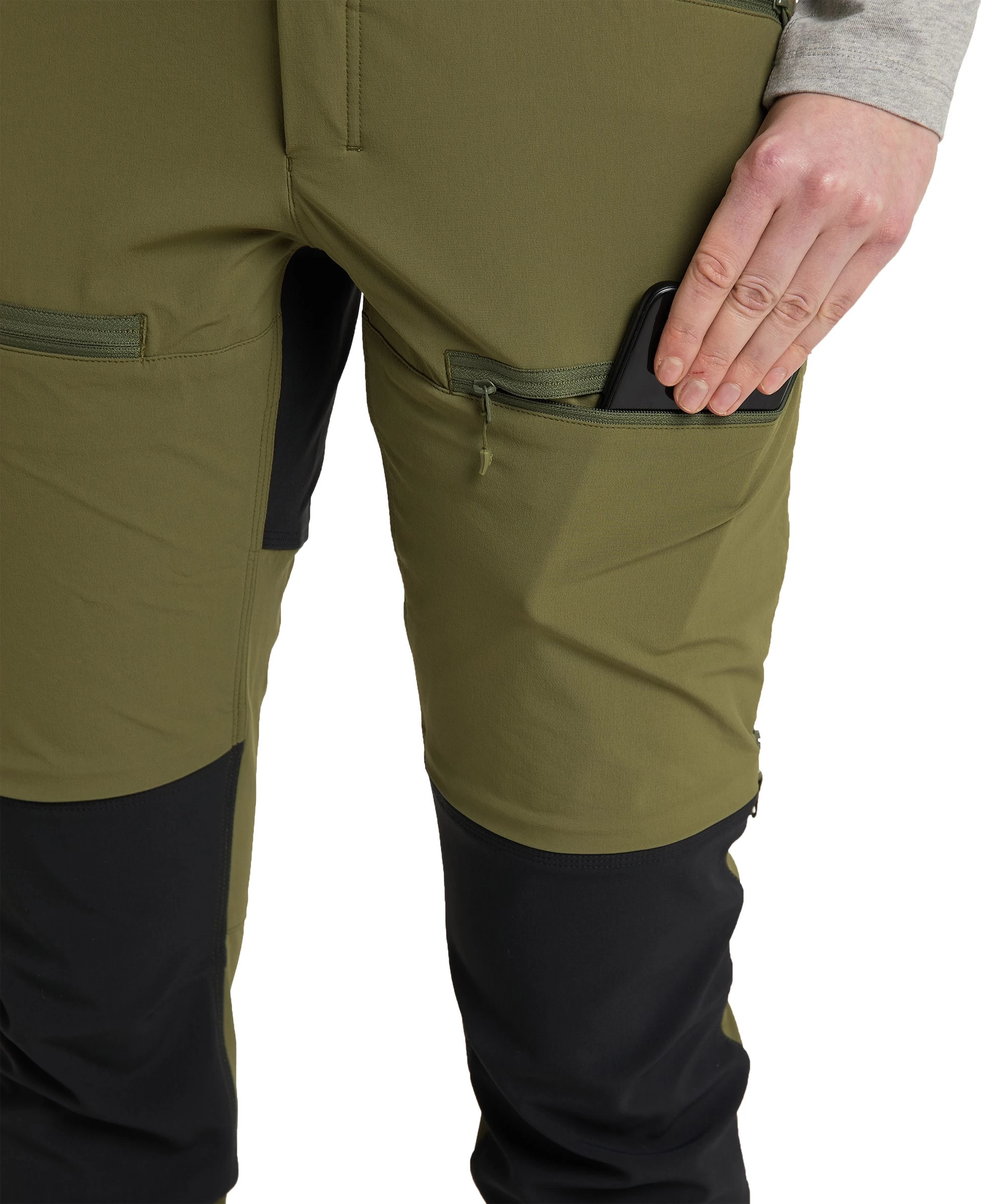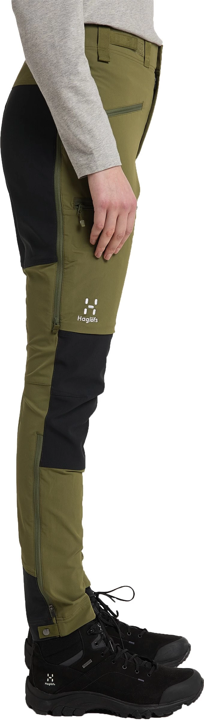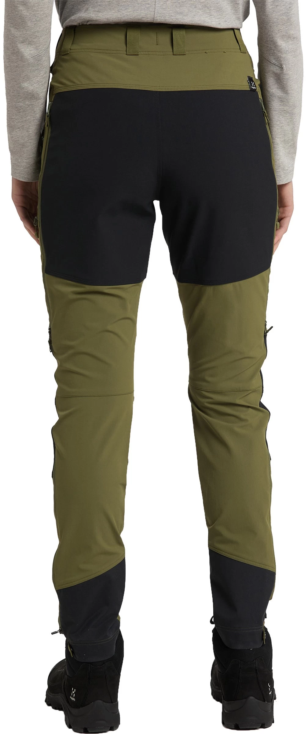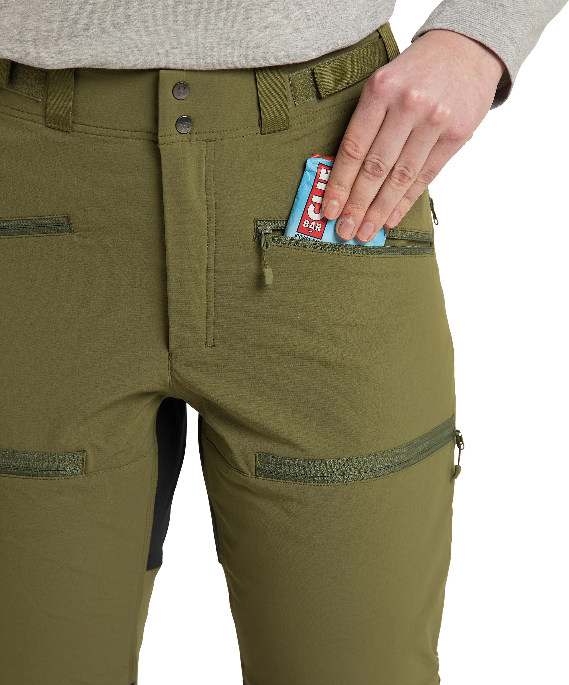 Haglöfs Rugged Slim Pant Women er ekstra tæt skåret, men bevægelsesfriheden er alligevel fantastisk god, både på grund af den fantastiske pasform og på grund af materialets strækbare egenskaber. Buksen er udstyret med en lynlåslukket lomme på hvert lår (hvoraf den ene er udstyret med en ekstra lomme til fx mobiltelefon) og to lynlåslukkede stiklommer. Et elastisk panel med Velcro® -justering ved hver hofte fuldender den fantastiske pasform og den enestående bevægelsesfrihed, som buksen tillader, og ophængningsstroppen gør det muligt at hænge buksen fra sig. Og så er Haglöfs Rugged Slim Pant Women naturligvis forberedt til montering af bælte.