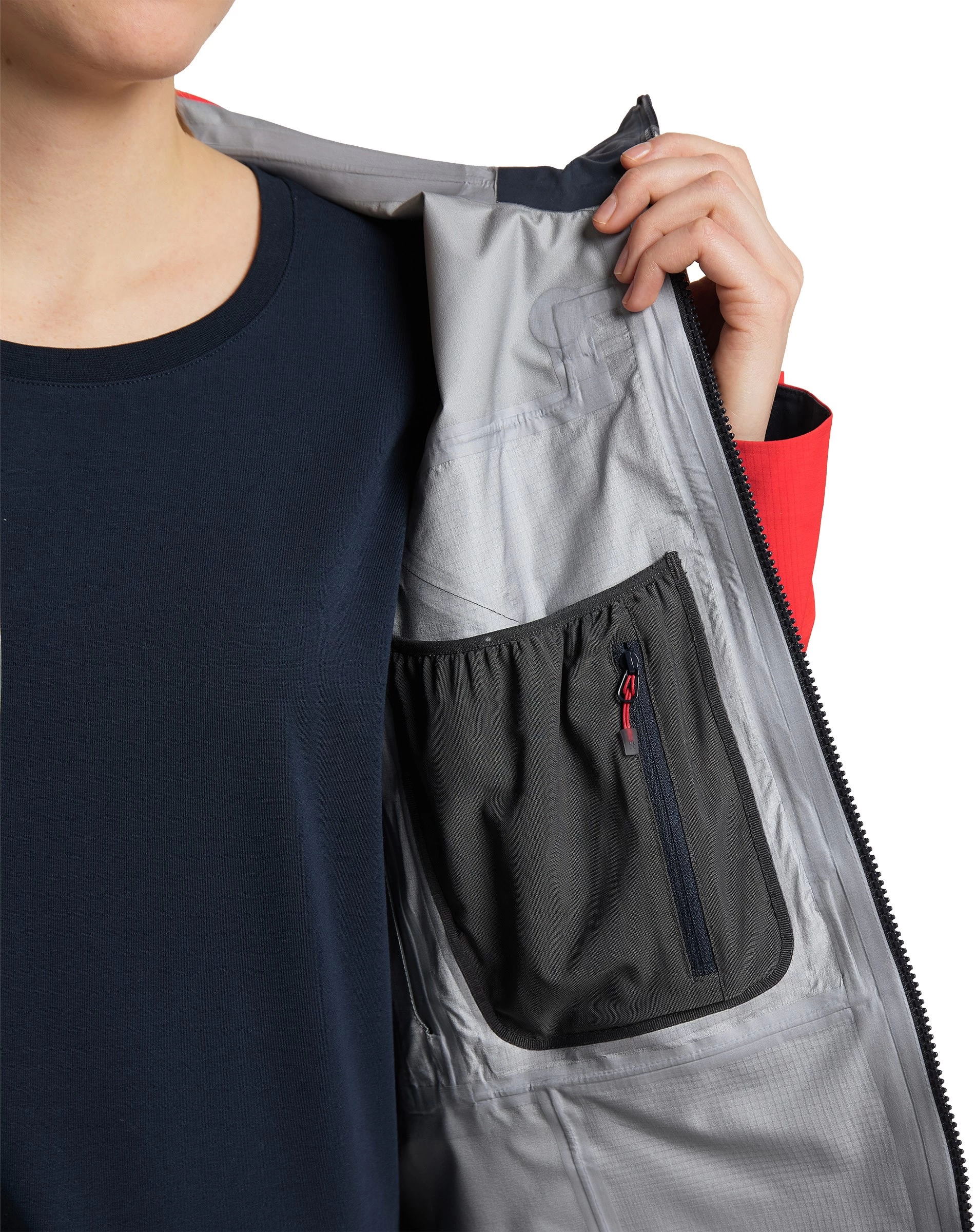 Den meget robuste, vandtætte og tovejs regulerbare frontlynlås – som er udstyret med bagvedliggende og afstivet stormflap – er en gennemprøvet YKK® AquaGuard® VISLON®, og indgangene til de særdeles rummelige lommer på brystet betjenes ligeledes med robuste og frostsikre YKK® AquaGuard™ VISLON®, som desuden er meget letløbende, så de er nemme at betjene med én hånd, når du sidder i klatreselen. Indvendigt er der en rummelig stiklomme og en lynlåslomme i ventileret stretch-materiale, og på det ene ærme findes yderligere en vandresistent lomme til de småting, man skal have nem og hurtig adgang til.