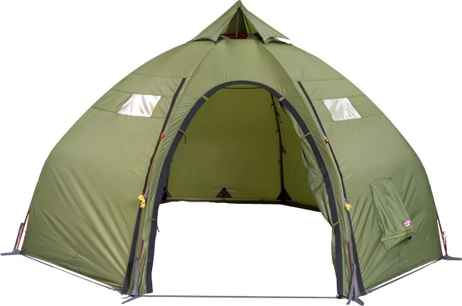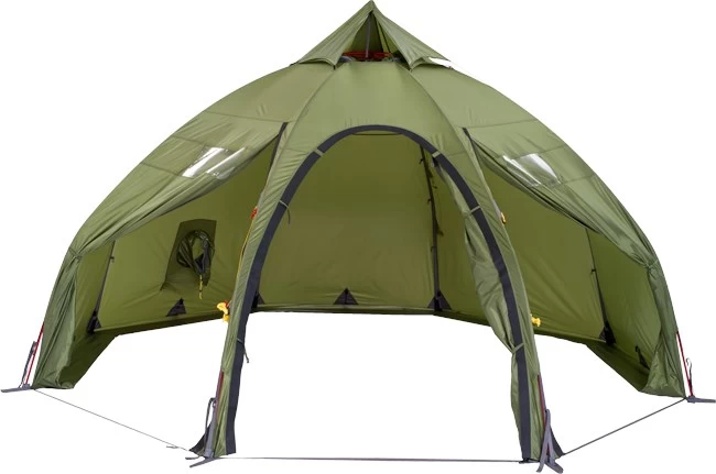 Kuppelkonstruktionen gør, at teltet får ekstra stejle vægge, hvilket afstedkommer en utrolig god plads indeni teltet og en rigtig god højde. Varanger Dome 8-10 er udstyret med tre store indgangsdøre, hvoraf de to er forsynet med vinduer, som giver godt med lys og mulighed for at følge med i vejrudviklingen. Myggenettet i indgangsdøren sørger – sammen med de justerbare ventiler og den regulerbare tophat – for at sikre et godt indeklima i teltet.