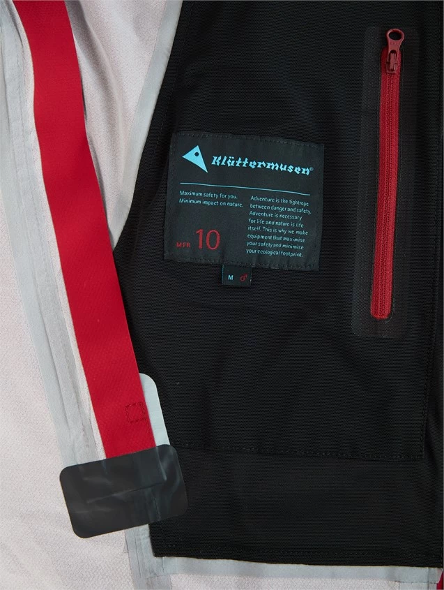 Grundet metervarens strækbare egenskaber er Klättermusen Allgrön 2.0 Jacket skåret med et kropsnært snit, som ingenlunde føles hæmmende. Denne fænomenale skæring resulterer desuden i langt færre syninger, end det normalt er tilfældet med jakker af denne type. Ærmerne er diffentialskåret og forlænget på bagsiden af håndryggen for bedre pasform. De mest udsatte områder, altså omkring hofterne, på albuer og ned omkring håndleddene er Allgrön 2.0 Jacket ekstra forstærket med pålaminerede Duracoat™ -paneler, der simpelthen ikke er til at slide op. For at få en ordentlig lukning omkring håndleddet er ærmeafslutningen udstyret med en ikke mindre end genial, elastisk sammenlukning, der nemt betjenes med én hånd. Samme type sammensnøring findes nederst i hver side. Da frontstykket er skåret meget kropsnært, er det kun bagstykket, der snøres sammen.