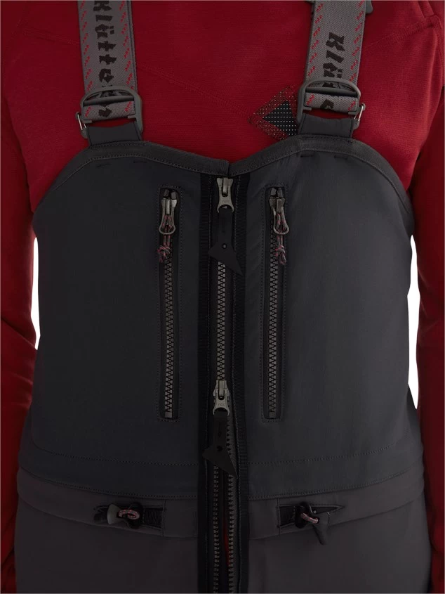 Selve bryststykket er fremstillet i en ekstra strækbar, vindresistent, vandafvisende og superåndbar nylonvævning, der på bagsiden er foret med en blød mikrofiber for at give ekstra varme og højne fugttransporten. Samme foring er brugt på bagsiden omkring lænden. På fronten sidder en tovejs lynlås (igen en robust YKK®, selvfølgelig!), som dels muliggør ekstra lufttilførsel henover brystet, når der virkelig knokles på randonee-turen eller den lange klatrerute, og dels gør det lettere at forrette den lette nødtørft. Bagsiden af lynlåsen er dækket af to tætliggende, nærmest overlappende stormflapper, som gør lynlåsen vandresistent.