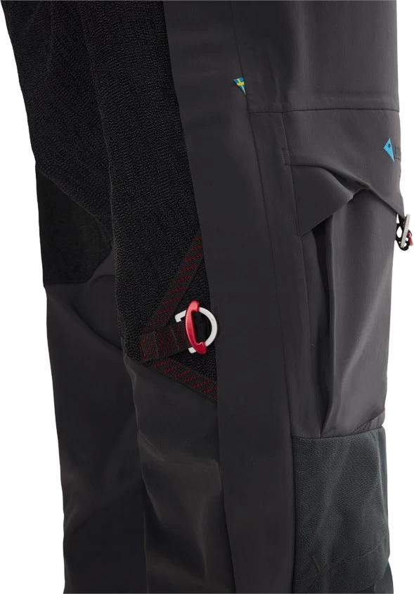 Klättermusen Freke 2.0 Salopettes Regular er udstyret med en fuld, tovejs lynlås i hver side, der gør det let at trække dem ud over de store støvler og samtidig muliggør ventilation på dage med højt aktivitetsniveau. Denne tovejs lynlås, som er en yderst gedigen og frostsikker YKK® Vislon® -type, munder øverst ud i en dobbeltknappet såkaldt ‘drop seat’, der betyder, at du kan klappe ‘bagsmækken’ ned og forrette din nødtørft, uden at skulle afmontere seler (og dermed jakken!). En meget bekvemmelig detalje – især på de regntunge efterårsdage eller de frostkolde vinterdage på krævende fjeld- og isklatreture. De lange lynlåse i siden er dækket af en bred, afstivet stormflap, der lukkes med en stærk Velcro® -kvalitet.