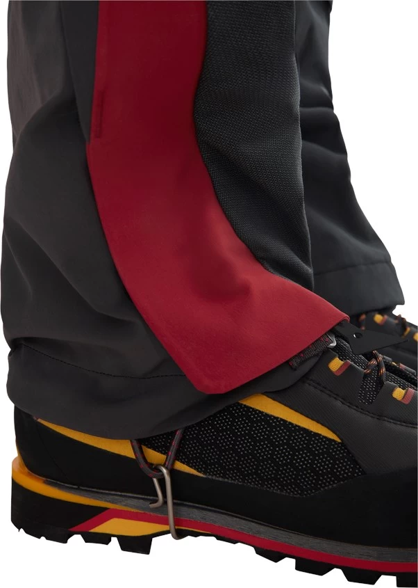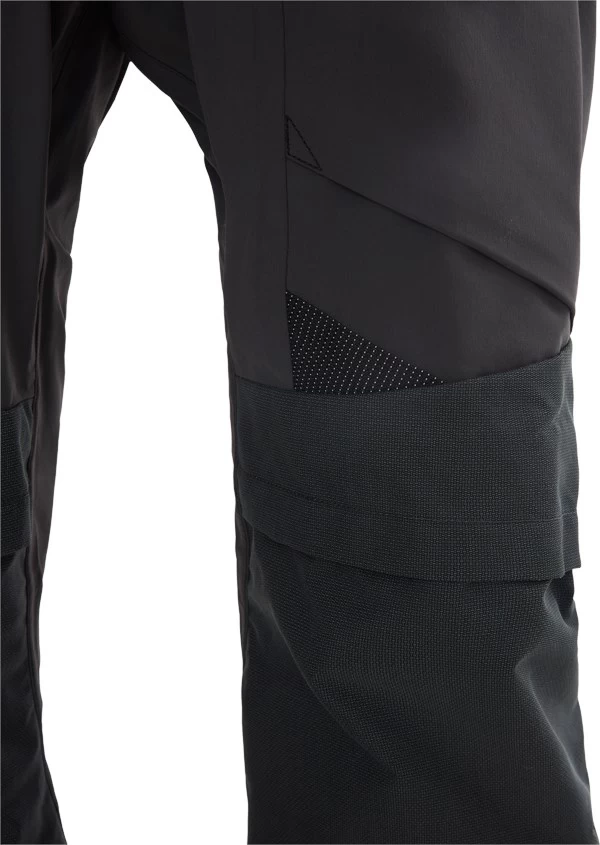 Omtrent midt på lynlåsen holdes buksebenet sammen af en kraftig pindelås, som effektivt aflaster lynlåsen, og vidden omkring ankelen justeres meget fikst ved hjælp af en 20 mm bred, enhåndsbetjent nylonrem. Der medfølger et Klättermusen Gaiter Kit, der gør det muligt at integrere en gamache i buksen. Dette sker ved, at den kraftige elastiksnor, der fra fabrikken er monteret i løbegangen nederst omkring ankelen, indbindes i de medfølgende stålwirer, som formes som et U, så de passer under støvlen. Den allerede eksisterende sammensnøring omkring ankelen på buksen gør, at en tæt omslutning omkring ankelen sikres. Simpelthen en genial løsning!