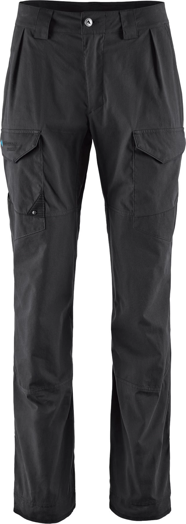 Grimner Pants er naturligvis forberedt til bælte og er udstyret med et par tilpas dybe stiklommer og en rummelig bælglomme på hvert lår, der er placeret, så man kan komme ordentligt til dem. Der er er altså tale om rigtige, funktionelle lårlommer og ikke de sædvanlige små sidelommer! De to lårlommer entreres gennem meget gedigne YKK® -lynlåse, der ikke fryser fast. De store gummihængere (som naturligvis er udformet som Klättermusens logo) på lynlåsene gør det nemt at åbne og lukke lommerne. Lynlåsene til de to lårlommer er gemt bag knaplukkede stormflapper.