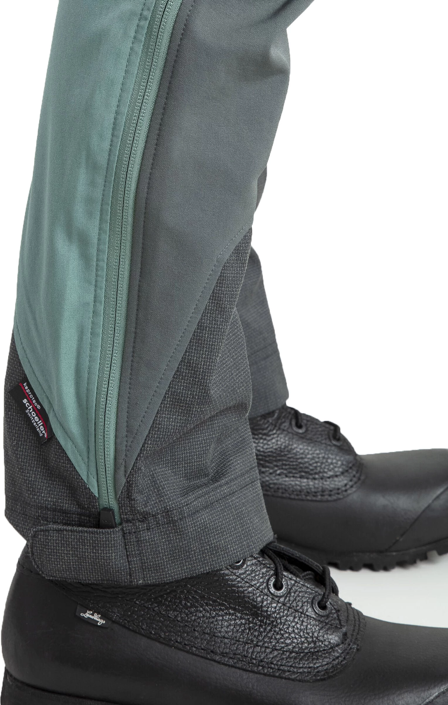 Hele den nederste kant og indersiden af det nederste af benene er forstærket med det bomstærke Schoeller® Keprotec®, som er en vanvittig stærk Kevlar® -vævning bestående af 76% nylon og 14% Kevlar® og 10% PU, der tager sliddet fra de store bjergstøvler og det ufremkommelige terræn. Buksen holdes fast til støvlen ved hjælp af en lille krog, der er gemt væk i en lille lomme, når den ikke er i brug, og vidden af buksebenet reguleres med knaplukning.