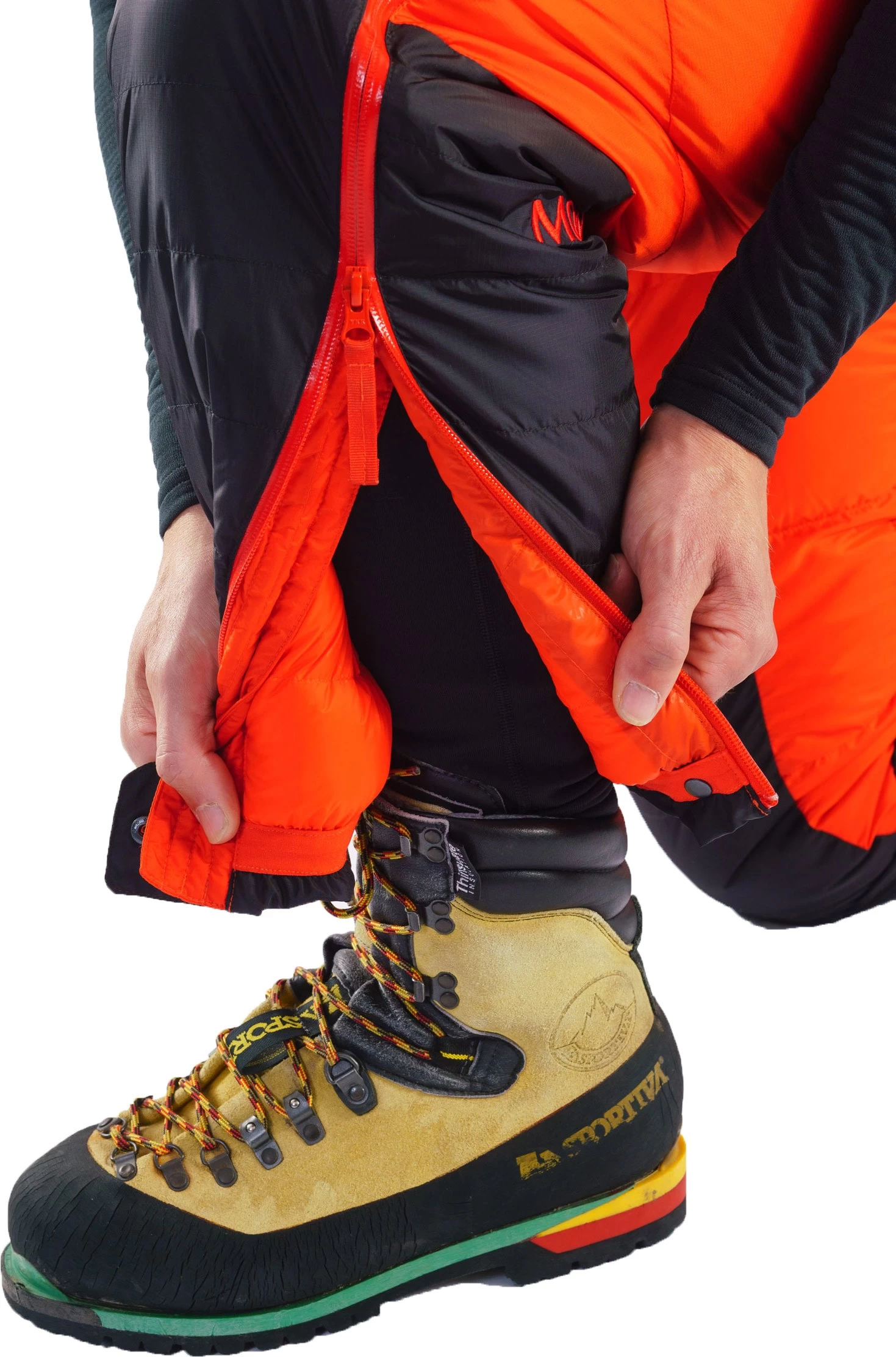 For at sikre maksimal bevægelsesfrihed er både området omkring skridtet og selve benene formsyet til perfektion, og Apex 8000 Down Salopettes er i hver side udstyret med en hoftelang, trevejs regulerbar og vandtæt YKK® AquaGuard® -lynlås med bagvedliggende og velforet stormflap med knaplukning, som afstedkommer en konstruktion med mange fordele: For det første gør den uhyre bukserne nemme at trække ud over de største bjergstøvler, for det andet gør den det muligt at komme til lårlommerne i de bukser, man måtte have på under og endelig giver den en meget fin ventilationsmulighed, når man lige skal have lidt frisk luft ind. Og den smarte knaplukning bag lynlåsen gør det netop muligt at åbne lynlåsene helt op for ventilation, uden at bukserne blæser helt op. Omkring anklerne lukker det elastiske panel tilpas tæt til omkring de store forede alpinstøvler.