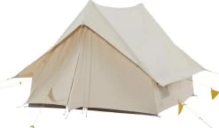 Alfheim 19.6 Technical Cotton rejses altså nemt og hurtigt ved hjælp af en enkelt midterstang af en både stærk og let aluminiumslegering. Teltet har en udvendig højde på 350 cm. og en diameter på 500 cm. og er nemt at komme ind og ud af, takket været den omvendt T-formede lynlås i store indgangsdør med bagvedliggende myggenet.
