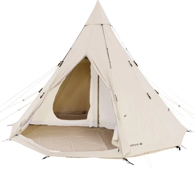 Dette Alfheim 19.6 Technical Cotton er med sit grundareal på 19,6 m2 og sin klassiske tipi-facon det helt ideelle telt, hvis familien eller en gruppe på op til 8-10 personer skal bruge et ekstra rummeligt og særdeles velventileret telt fx på de varme sommerture, men så sandelig også til krævende vinterbrug!