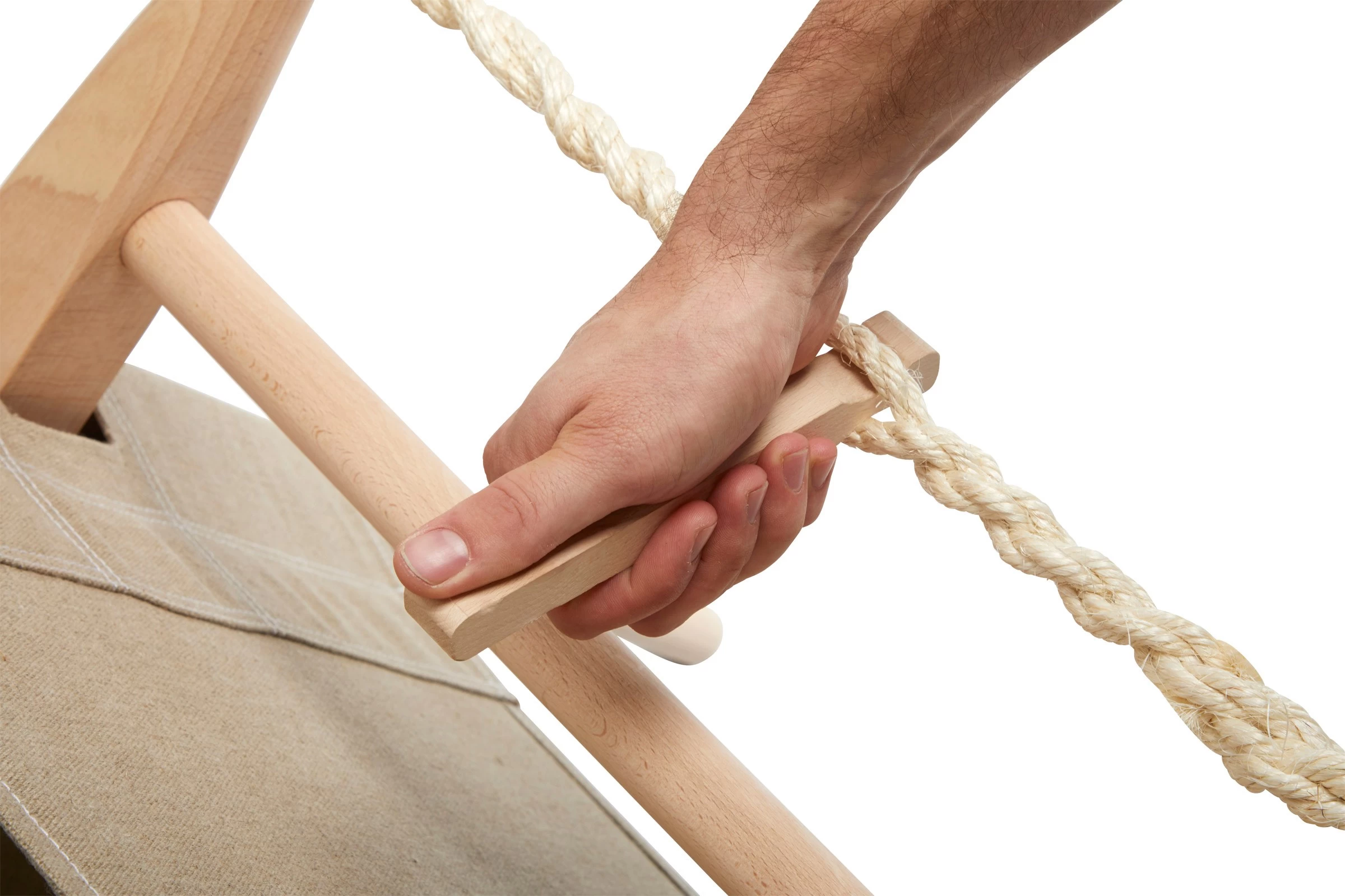 Moesgaard Wooden Chair er forbilledligt snedkereret af massiv bøg og med sæde og ryglæn i tætvævet hør og snoretræk af sisal. Stolen kan nemt og hurtigt og helt uden brug af værktøj samles og pakkes sammen igen, så den i den eksklusive pakkepose fylder mindst muligt under transport.