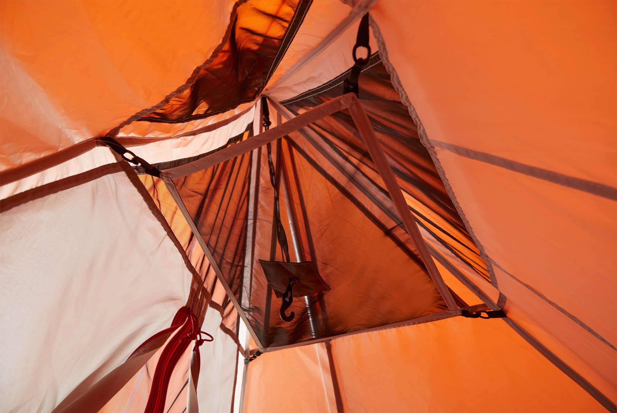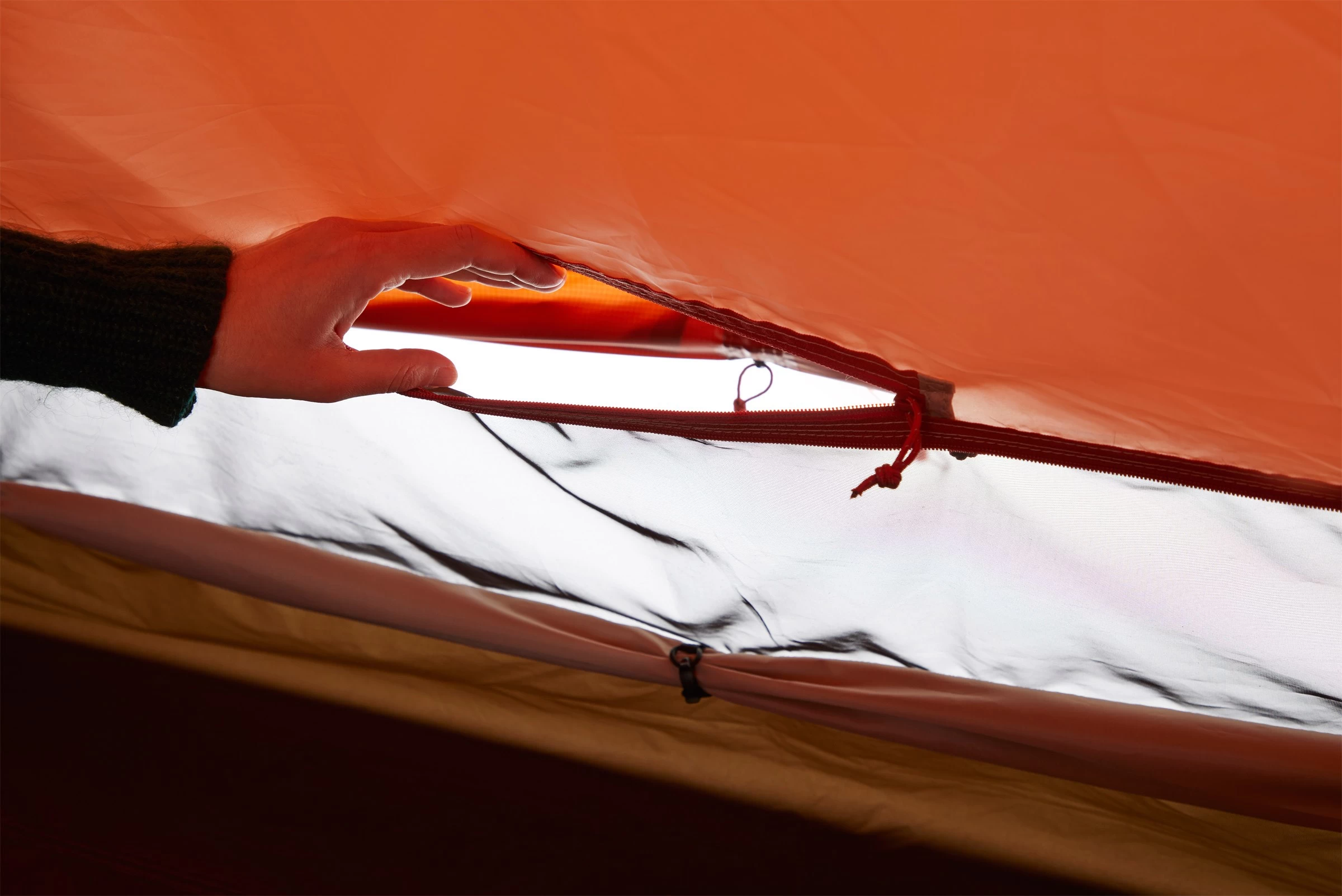 De velplacerede og justerbare ventilskakter i toppen af oversejlet og nederst på teltets bagside – hvor sidstnævnte i øvrigt er udstyret med en fiks lynlåsåbning, så man lige kan komme til de småting, man har lagt uden for teltet – sørger for den rette luftgennemstrømning og opretholdelse af det rette klima i teltet, også hvis selve hoveddøren i forteltet er lukket. Bag disse ventiler er der naturligvis myggenet, så det irriterende kryb ikke kan finde ind i teltet. De fine ventilationsmuligheder forstærkes af det store myggenetsvindue på hver side af teltet, som både giver udsigt, men altså også masser af frisk luft. Vinduerne kan dog lukkes af med gardiner, hvis vejret viser tænder eller man blot ønsker lidt privatliv i forteltet.