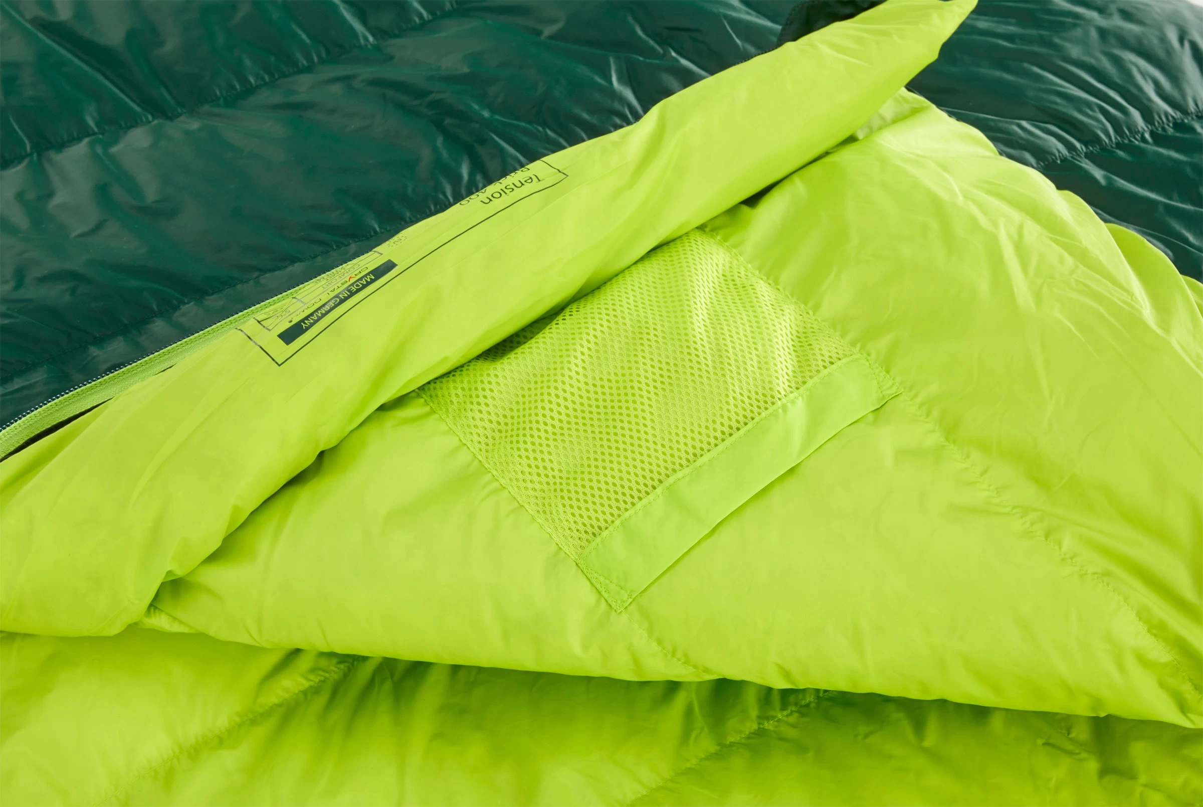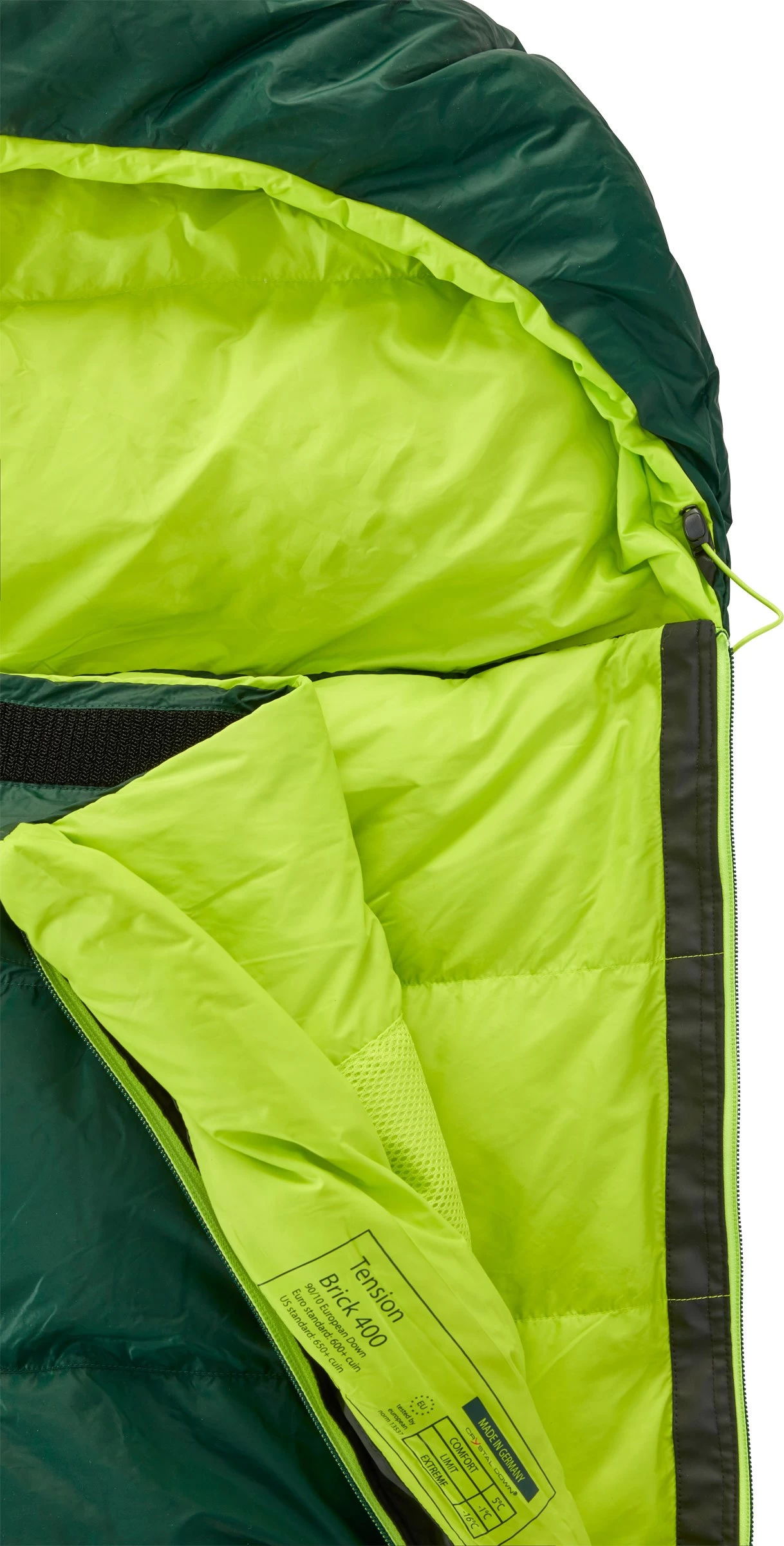 Både yder- og inderpose er fremstillet af det lette SoftCell™, som er et blødt, lækkert og meget slidstærkt nylontekstil, som dels føles yderst komfortabelt og dels sørger for god videretransport af overskudsvarme kroppens fugtafgivelse, samtidig med, at de vind- og vandresistente egenskaber er i orden. Tension Brick 400 Large er som nævnt fyldt med det lækreste Crystal Down™, som i denne model udgør omtrent 400 gram af totalvægten.